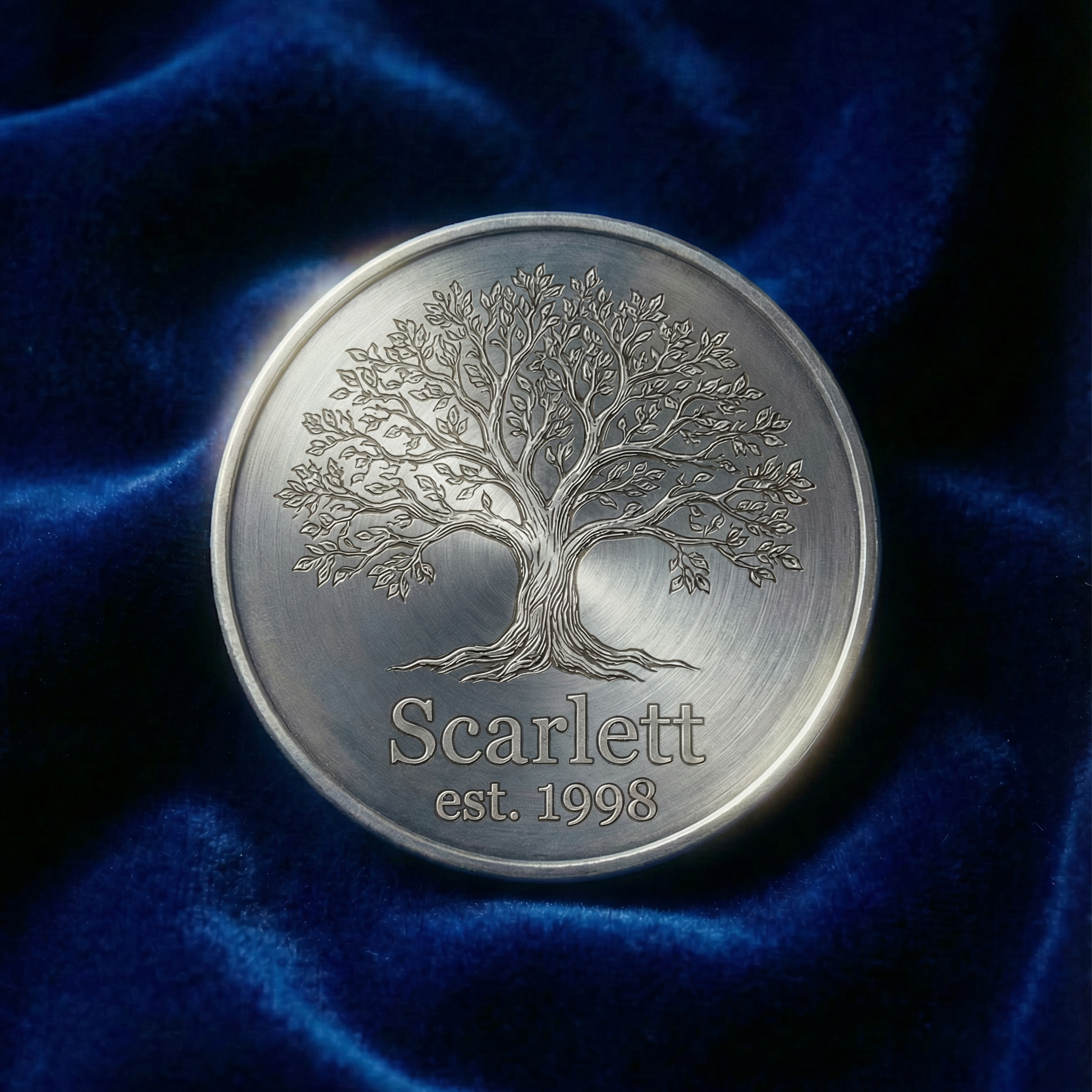 Coins (silver rounds) are 1 troy oz, 39mm in diameter, and fit in a standard coin capsule. Bars are heavier (5 oz or 10 oz), have a cast finish, and offer a larger engraving surface. Both are made from .999+ fine silver and laser-engraved with your custom design. Bars are ideal for display pieces, corporate awards, or when you want something with more weight and presence.